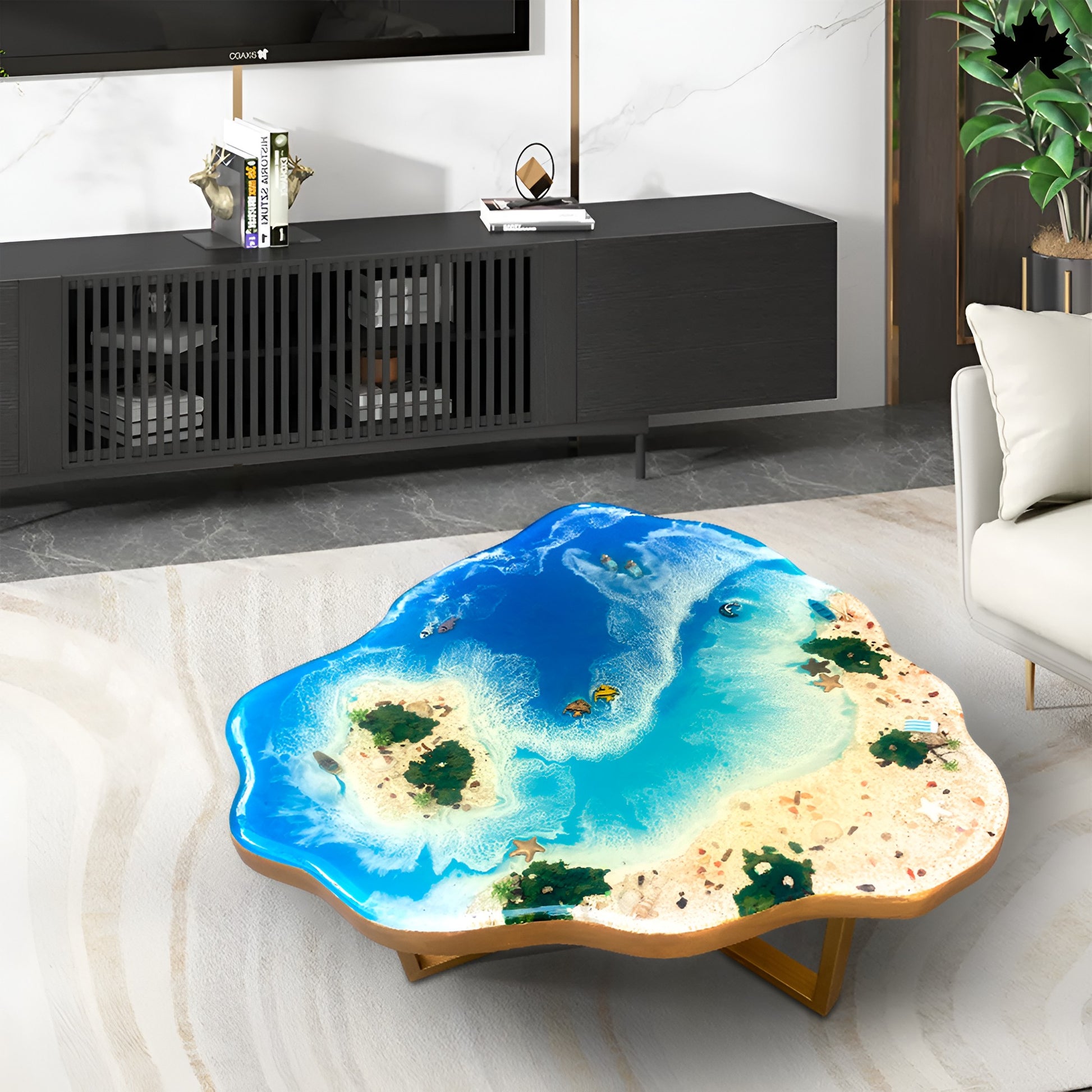 This beach art coffee table brings the serenity of a tropical shoreline right into your home. Designed with stunning epoxy waves, sandy textures, and miniature coastal elements, it creates a lifelike beach scene. The elegant gold base enhances its luxurious appeal, making it the perfect statement piece for modern interiors.