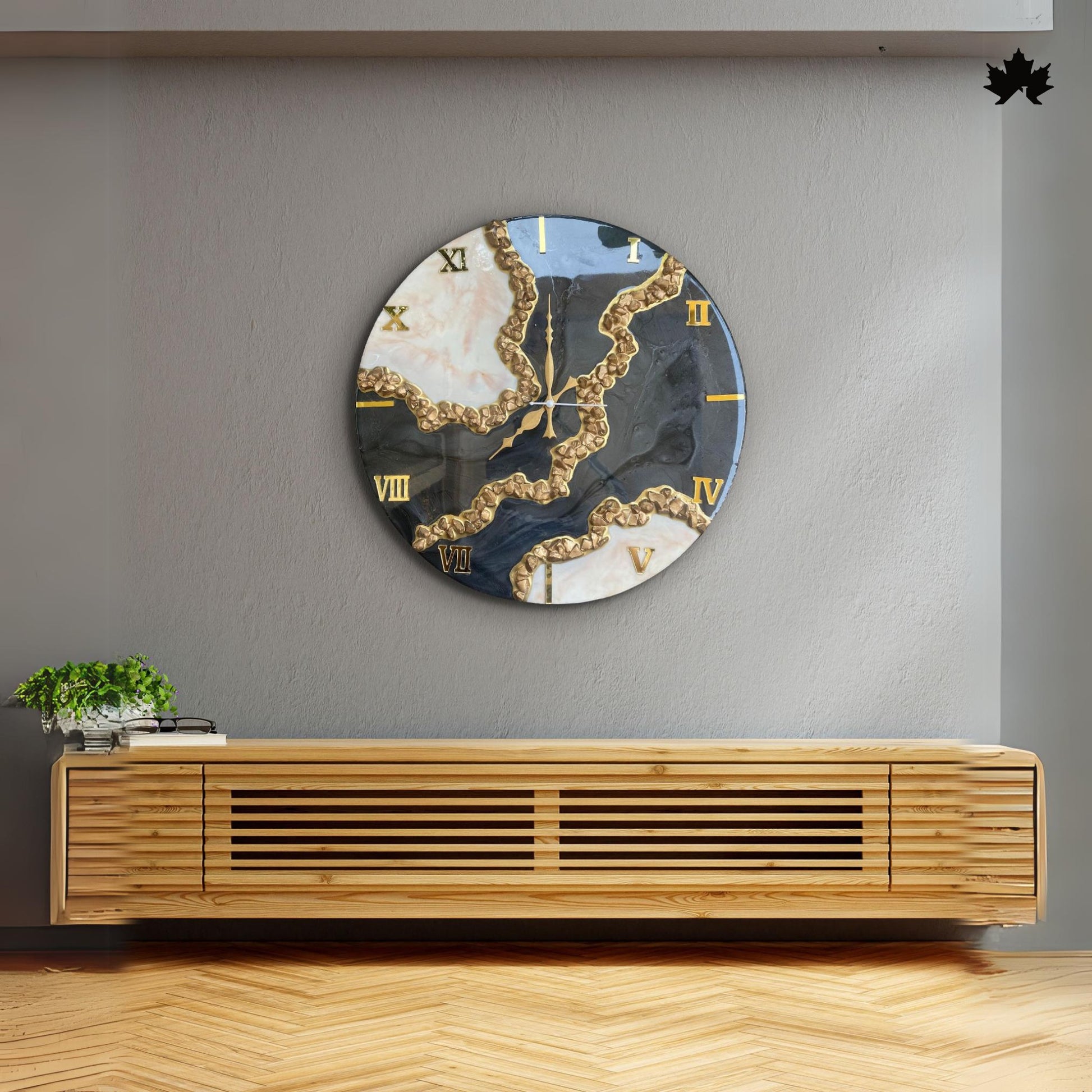 This handcrafted resin timepiece brings a bold, luxurious character to your interiors. Designed as part of our premium designer wall clock collection, it features a dramatic blend of black, white, and gold marble textures with raised gold detailing. The gold Roman numerals and high-gloss finish create a statement piece perfect for modern living rooms, offices, and sophisticated décor themes.