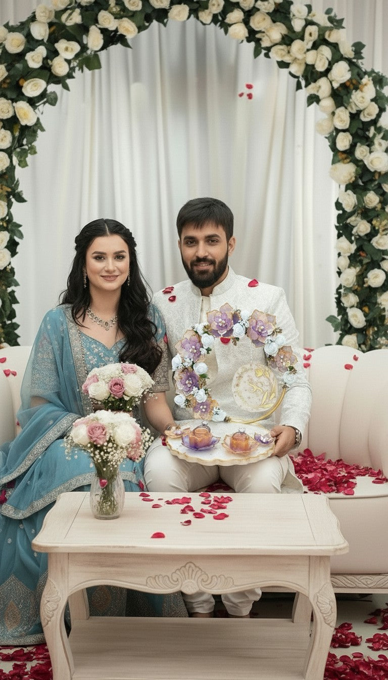 This handcrafted resin masterpiece transforms every ceremony into a stunning visual moment. Designed as a premium engagement ring platter, it features an elegant floral arch adorned with lavender-gold resin flowers, pearl accents, and delicate white roses. The personalised resin name tag adds a bespoke touch, making it perfect for roka, engagement, wedding photography, and gifting. A functional yet artistic keepsake that elevates your ring-exchange ritual.