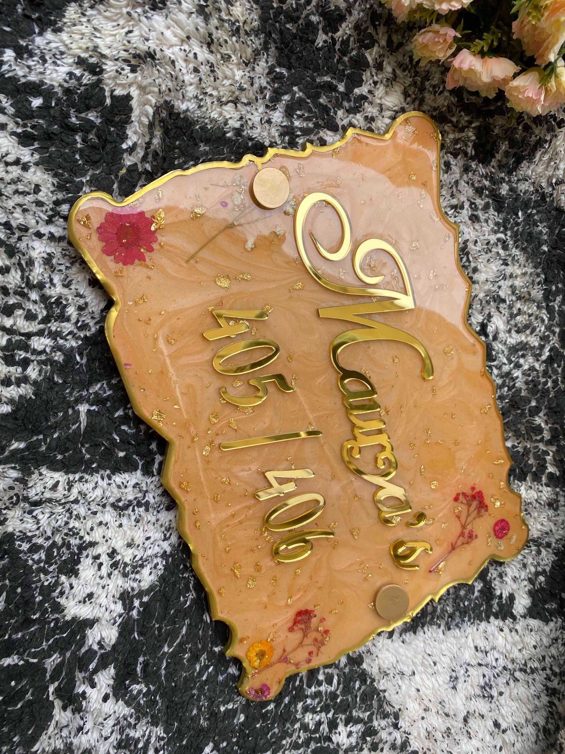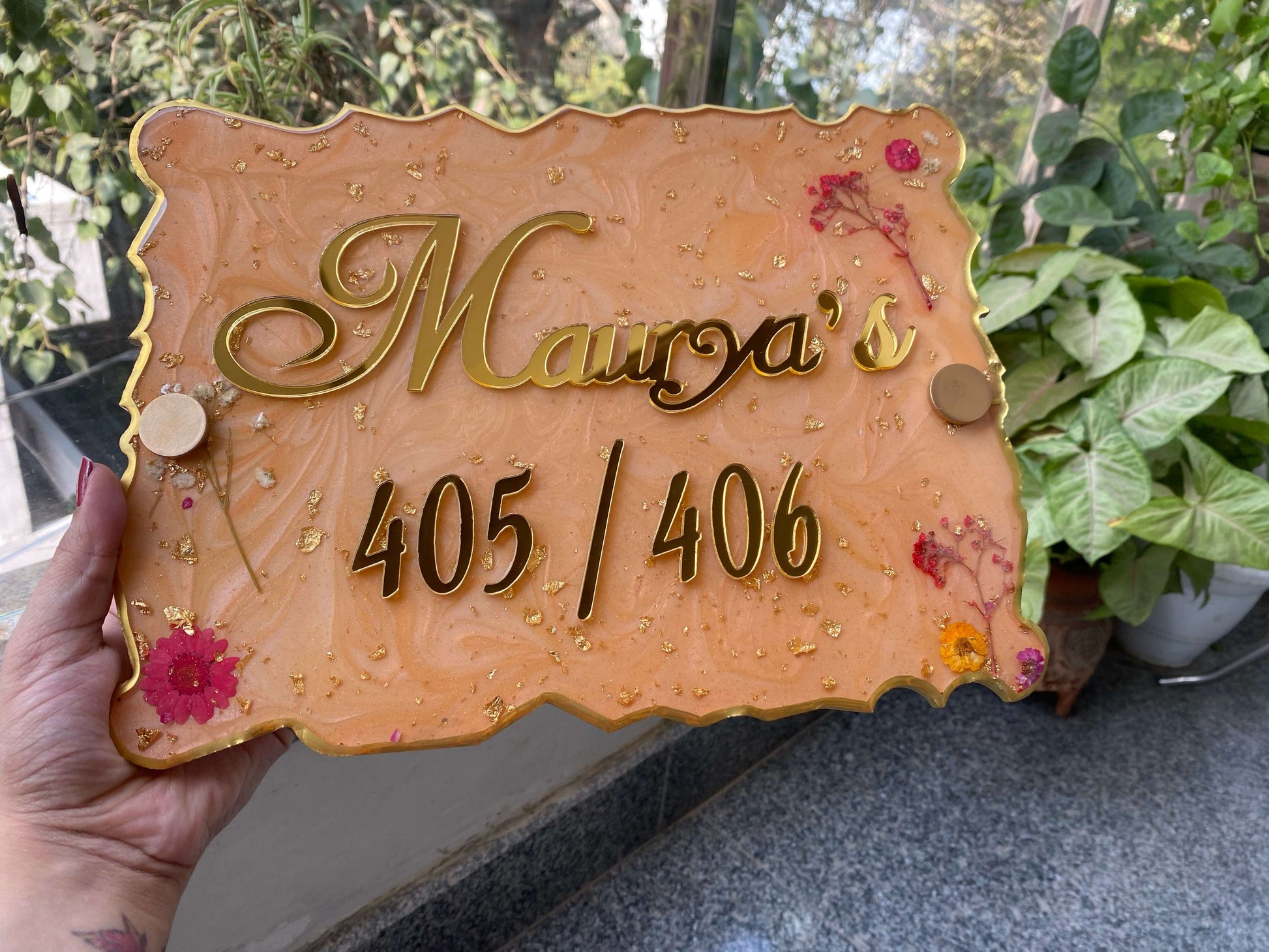 Redefine your doorway with this Modern Nameplate for Entrance, a handcrafted piece that merges elegance with individuality. The soft peach-gold background, detailed with delicate floral inclusions and fine gold leaf work, reflects the perfect harmony between modern aesthetics and traditional artistry.