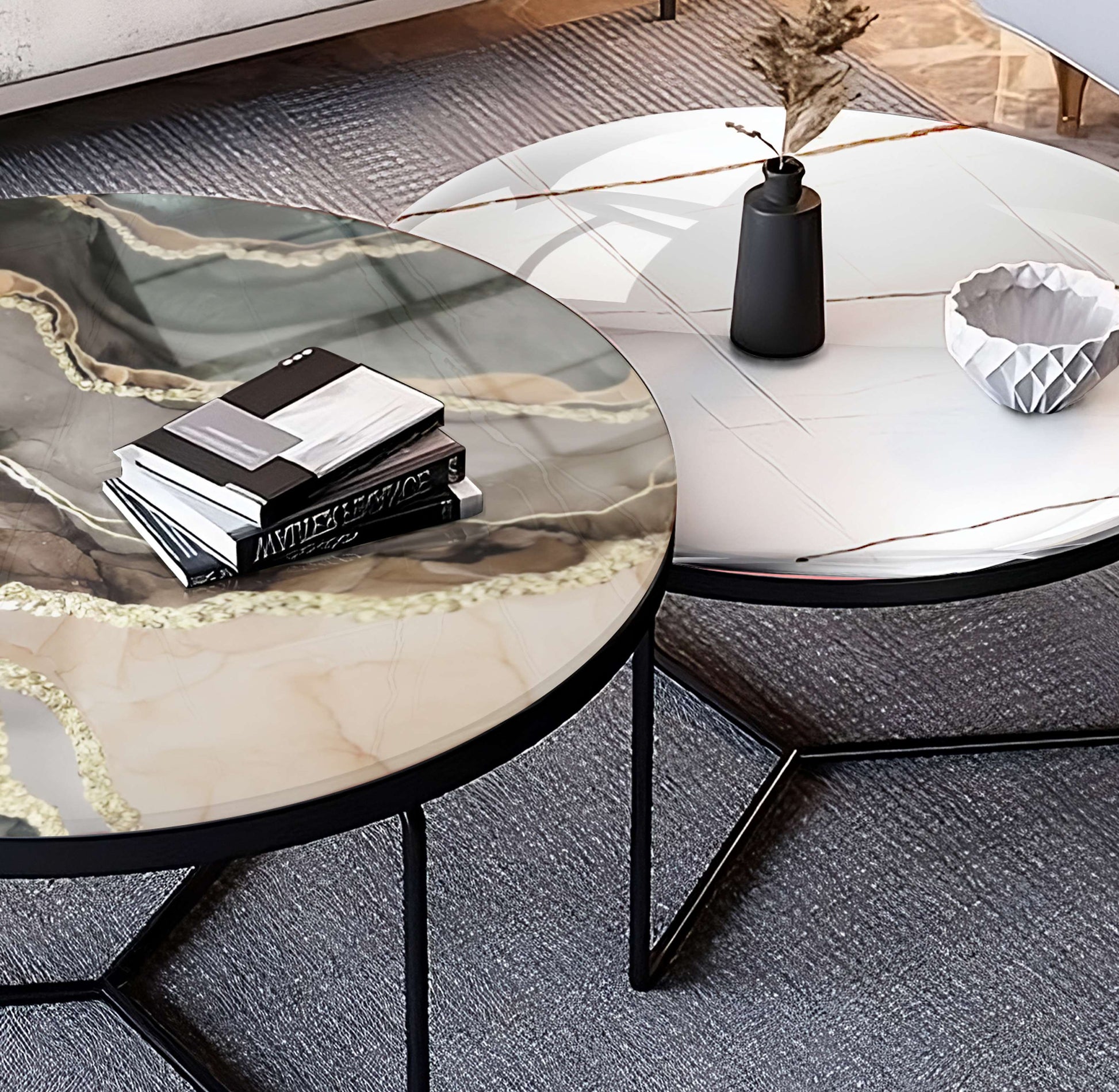 These nested tables for the living room bring contemporary elegance to your space. Designed with a stunning epoxy top paired with a sleek matte-black companion table, this set delivers both style and functionality. The artistic marble-inspired pattern makes it a statement piece for any modern home.