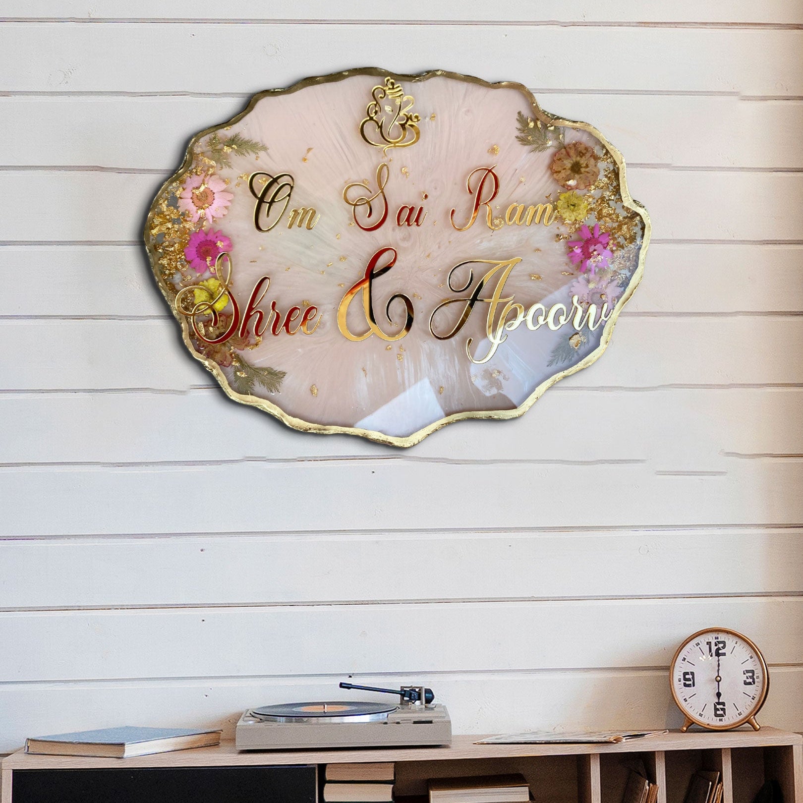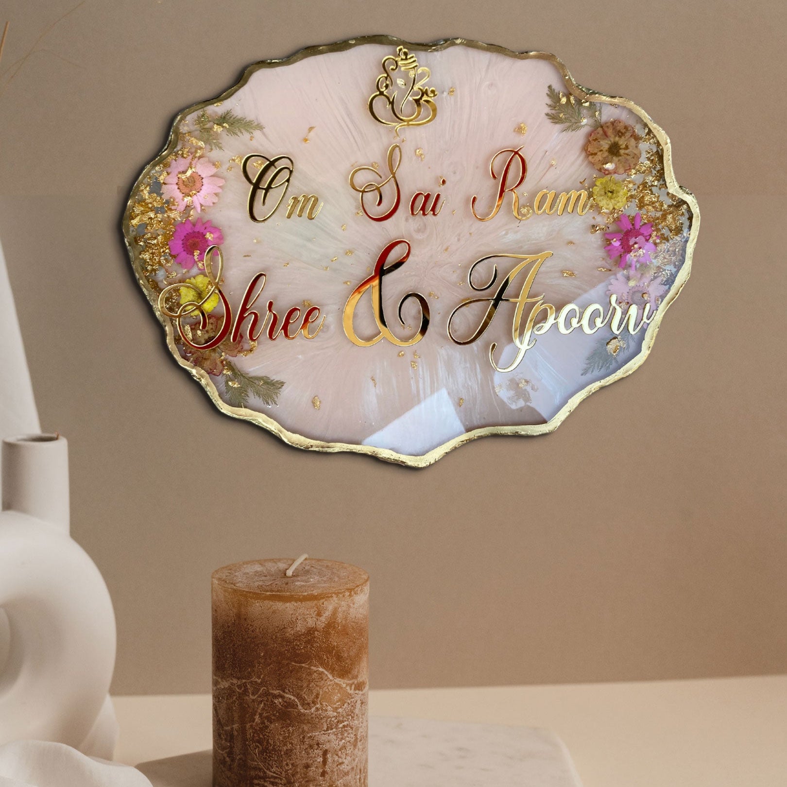 Meticulously handcrafted, this oval-shaped nameplate features delicate preserved florals, shimmering gold accents, and smooth pastel tones that add warmth to any space. The inscription “Om Sai Ram” at the top brings divine blessings, while the elegant typography of the names creates a personalized touch that stands out beautifully.